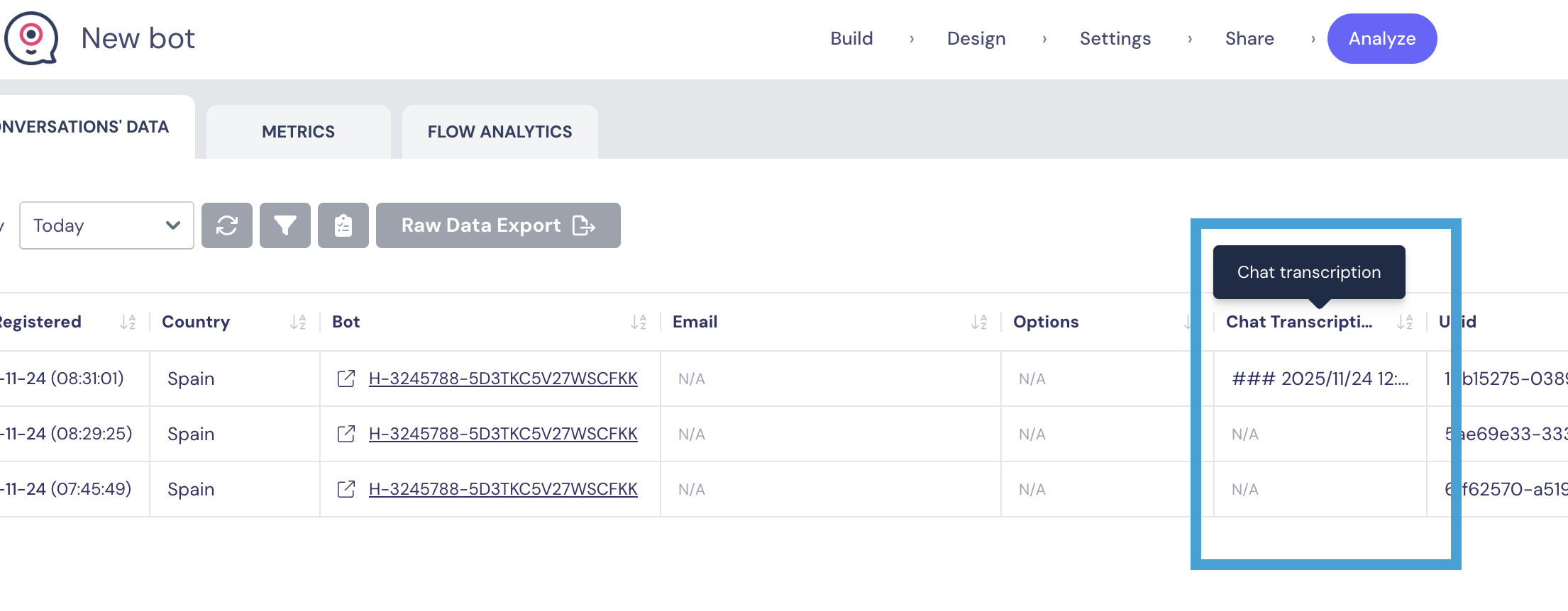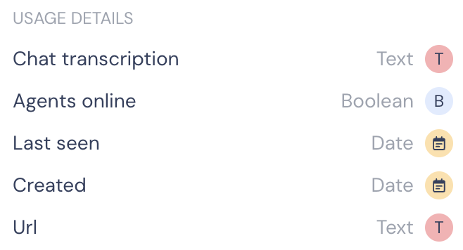 - Chat transcription[String]: Chat transcript of the user's responses throughout your bot flow. This can be used for tracking purposes. More info here.