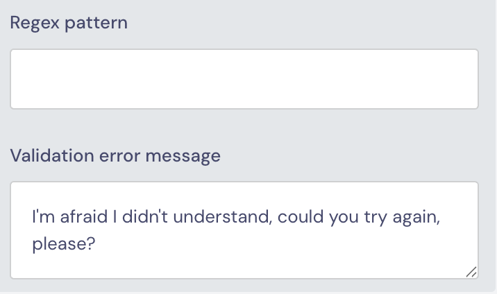 If you’re using input length settings or regex validation, don’t forget to customize the error message that will appear when a user submits an invalid answer. This helps guide them to properly answer the question and continue smoothly.