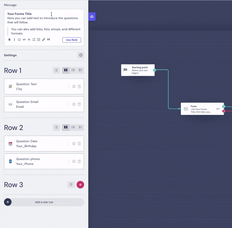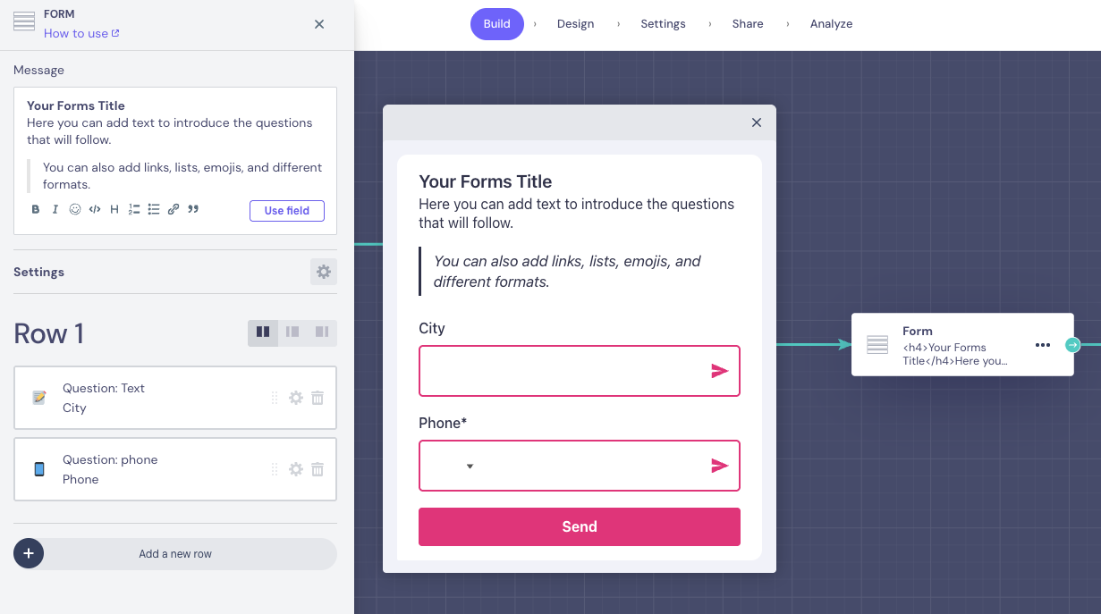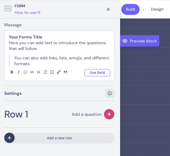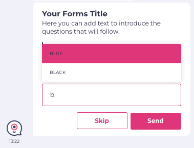 Answers are saved in the fields you specify. You can display them later using @fieldname, send to integrations, or use in conditions. In the Forms block, saving the answer in a Field is mandatory, and the question type determines the Field type.