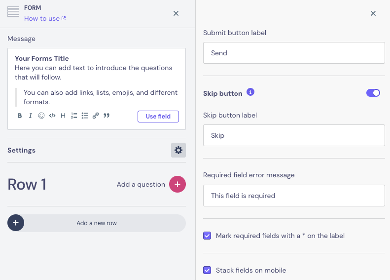 Enable the Required field? toggle for each question that must be answered. Users won't be able to submit until all required fields are completed.