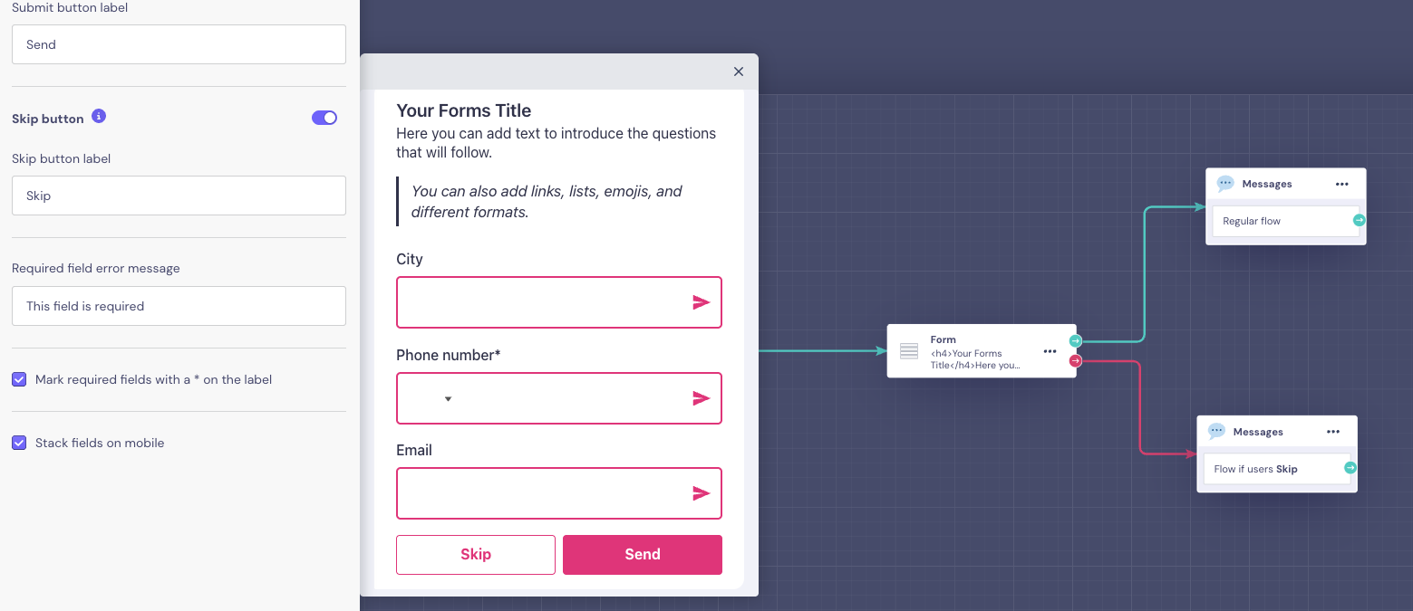 The flow continues through the skip output (if connected). No form data is saved when users skip.