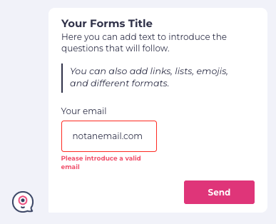 The form automatically validates that users enter a properly formatted email address. If the format is invalid, users will see an error message.
