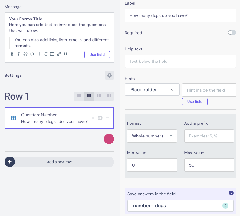 Use the Number question when you need users to provide numeric values, with options to set ranges and formats.