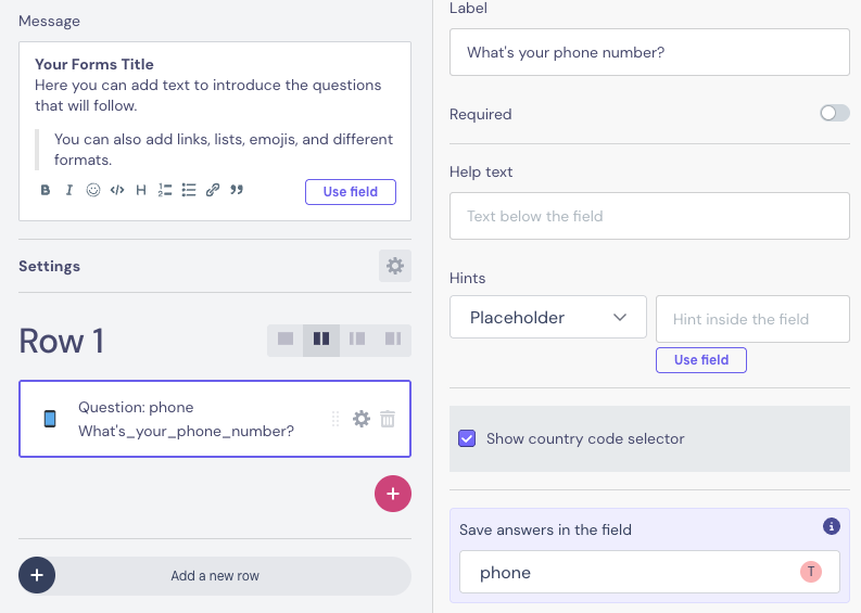 Save answers in the field β Defines where the user's phone number is stored.