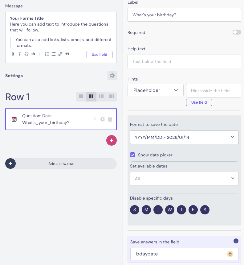 Save answers in the field β Defines where the user's selected date is stored.