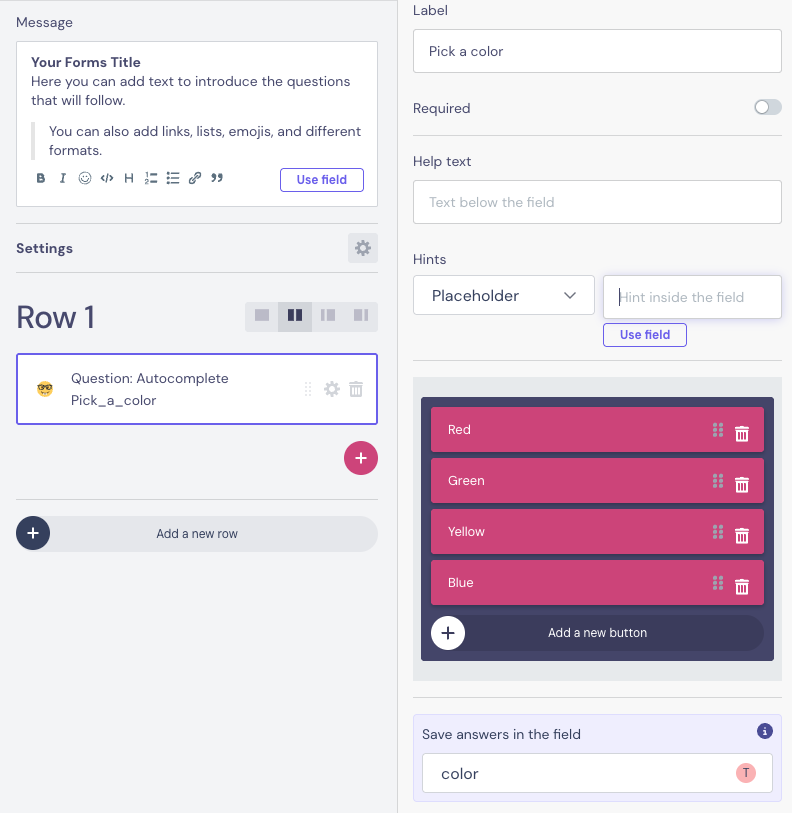 In the Forms block, saving the answer in a Field is mandatory, and the question type determines the Field type.