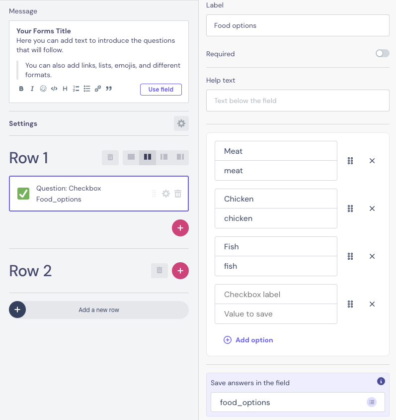 Add options β Create as many checkbox options as needed. Each option has: