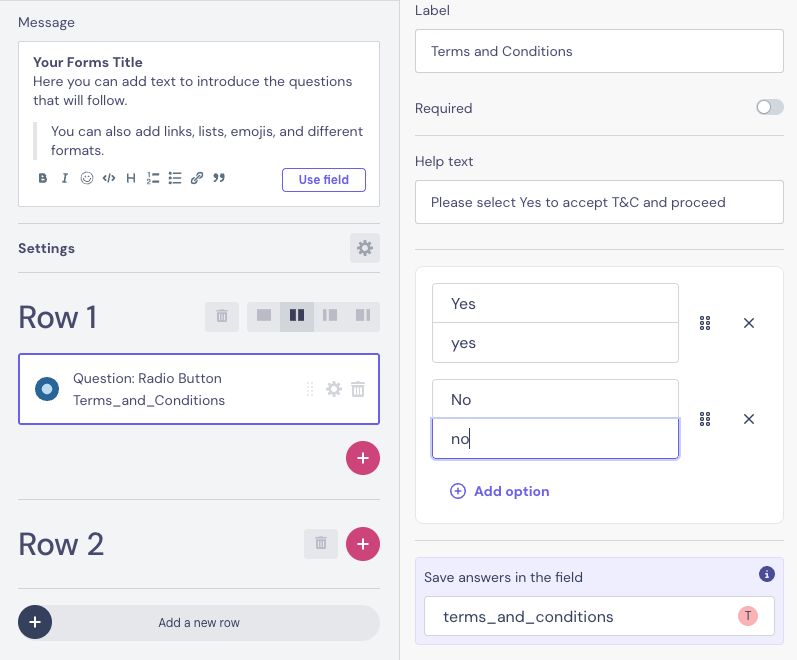 Use the Radio Button question when users need to pick exactly one option from a list. Very useful for Yes/No questions, for example when users need to accept Terms and Conditions.