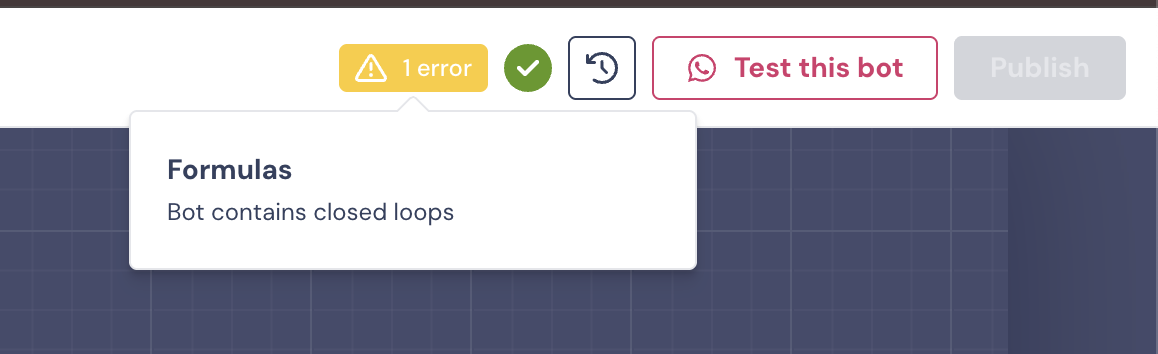 At the beginning of the flow, we will use a formula block to subtract 1 to the iteration field (very important, otherwise, we will be on an infinite loop), and then we will check at the end of the flow if this field equals to 0. If so, the loop ends and we can go on with the flow. Make sure you have a user input in the flow, on this example is the buttons block, otherwise we will get a closed loop error.