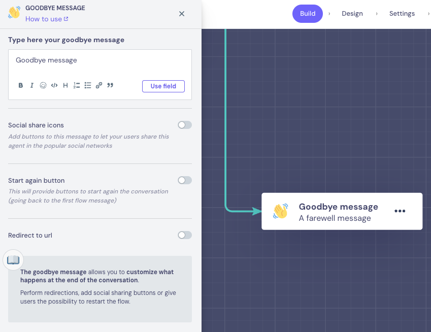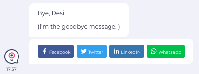 Use the Goodbye block when you want to end your web bot conversation with a special action: redirect users to a URL, add social sharing buttons, or let them restart the chat.