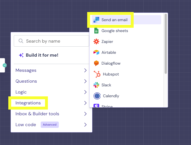 1️⃣ In your bot's builder, click to add a new block. Navigate to Integrations > Send an Email.