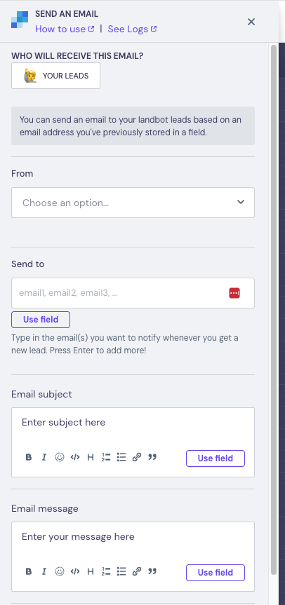 When building your bot, you might want to send emails from Landbot — whether it’s to capture leads instantly, send order confirmations, or follow up with customers.