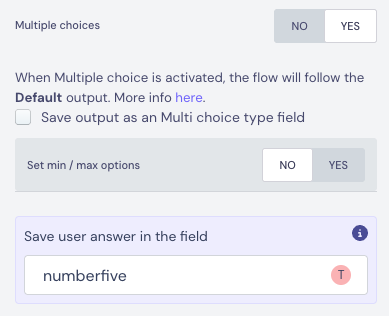 If you let users pick more than one option, and you want to use that later in your bot, don’t forget to check the box “Save output as Multi choice type field”. This ensures the answers are stored correctly, letting you reuse the data later in Dynamic Data, or display it in other Buttons, Cards, or blocks.
