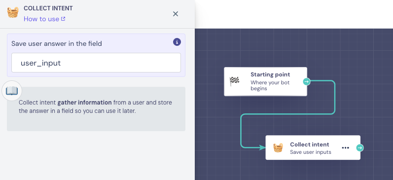 To capture the first user's input, you should start your flow with a Collect Intent block.