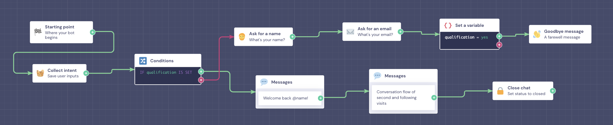 If you capture the first user's input, as explained above, you can also use it to direct a user through a different bot flow on their second visit!
