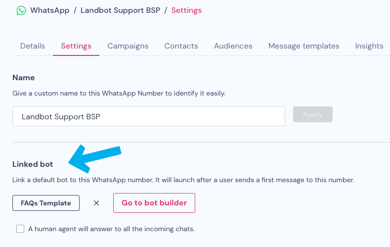 If you just want to use your WhatsApp number to have your Human Chat Agents answering chats, you can create a bot specific for that, with a simple flow leading to the Human Takeover block.