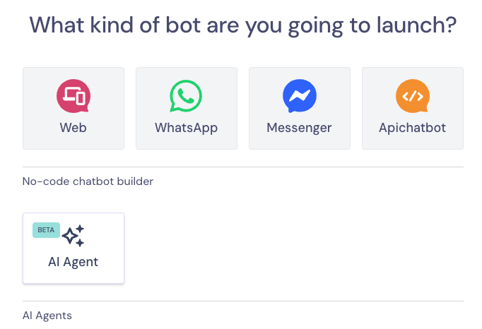To create a WhatsApp bot, click on the "Build a chatbot" option of your dashboard and select WhatsApp: