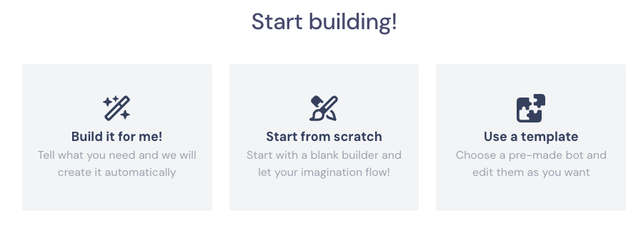 Once you select the WhatsApp bot will see that you can use our Build it for me feature, start from scratch (a new bot) or use a WhatsApp bot Template.