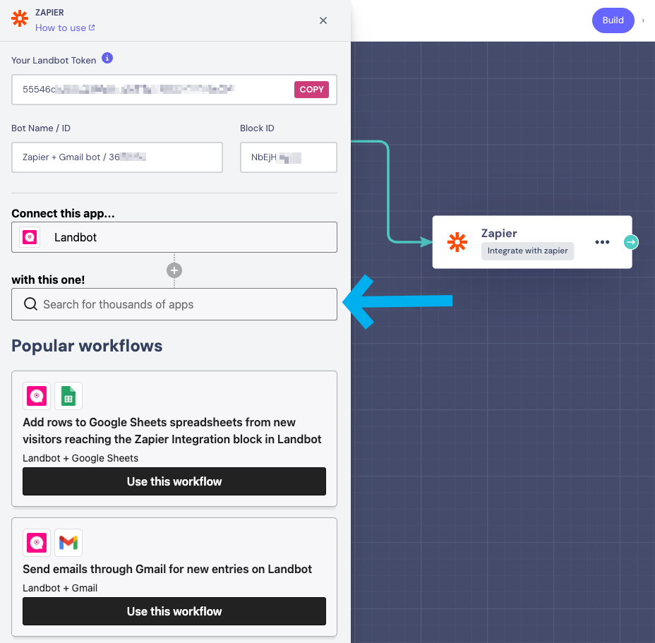 In your bot builder, drag and drop a Zapier block into your flow. The block settings will appear, and you can connect Landbot to Gmail either by typing “Gmail” in the search bar or selecting it from the popular workflows shown below.