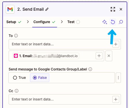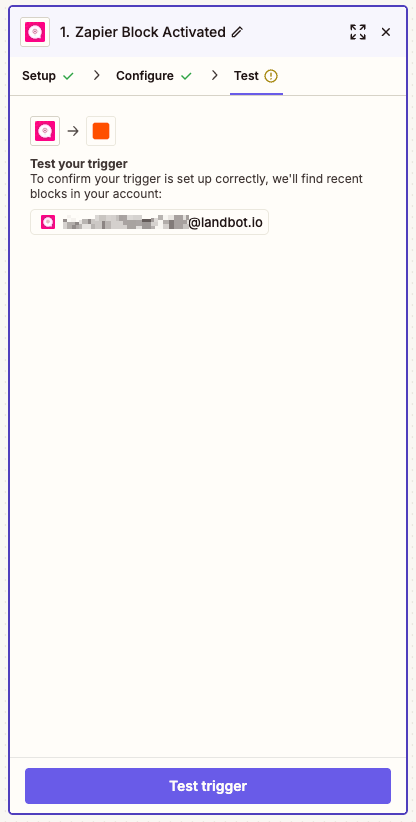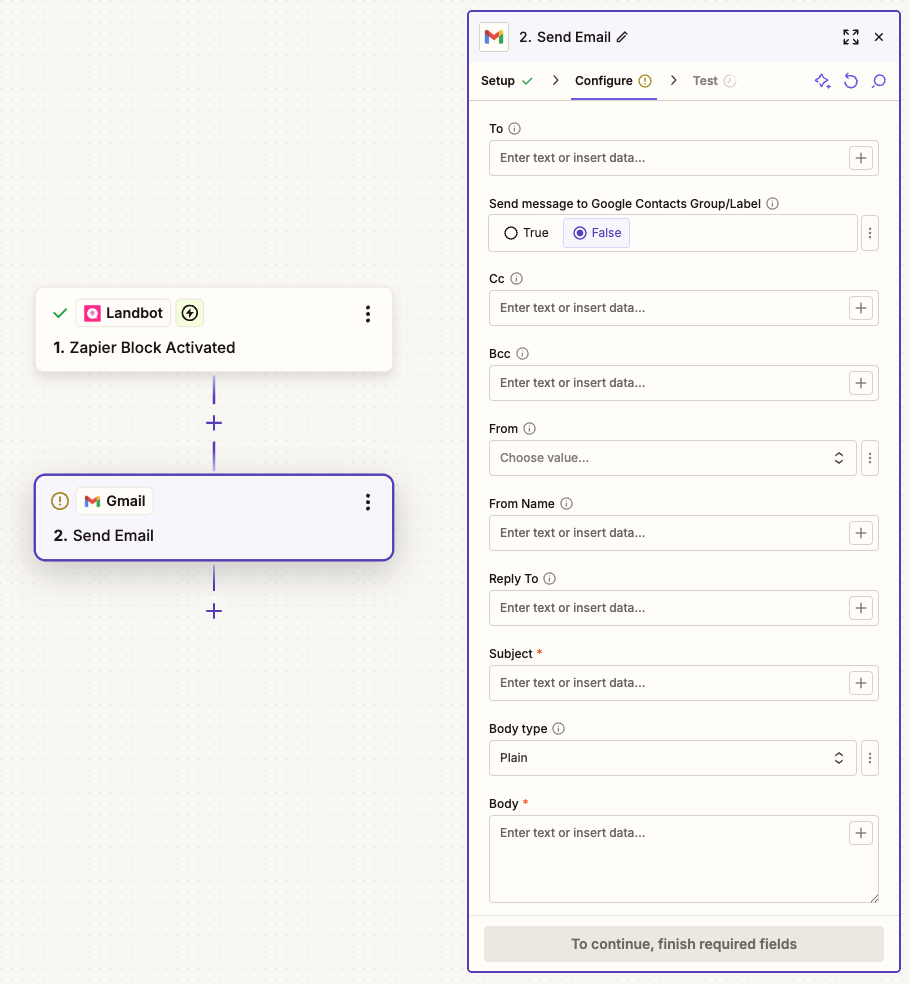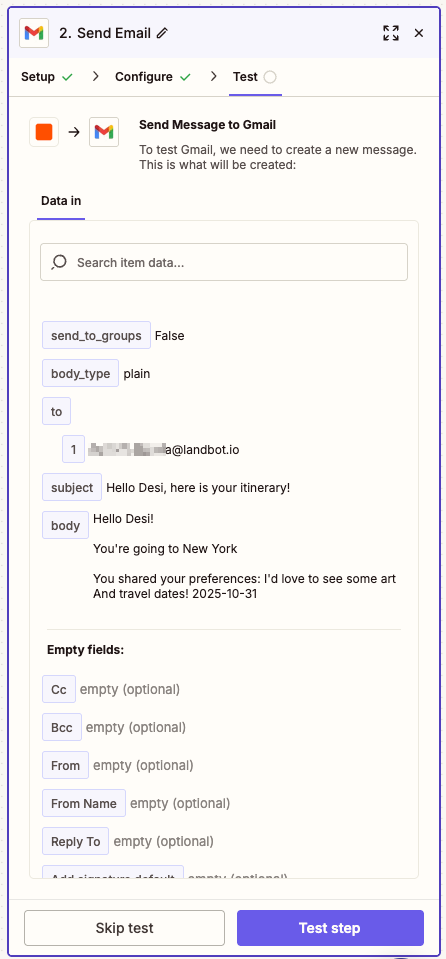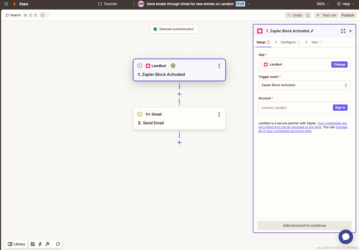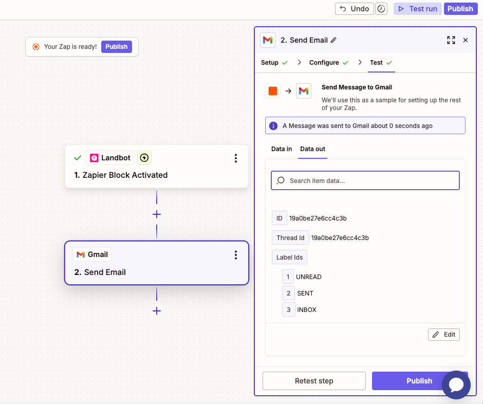 Go to your Landbot step → Test → then return to the Gmail step and test again. If it still fails, check that your bot has recent customer entries Zapier can pull from.