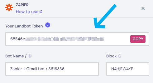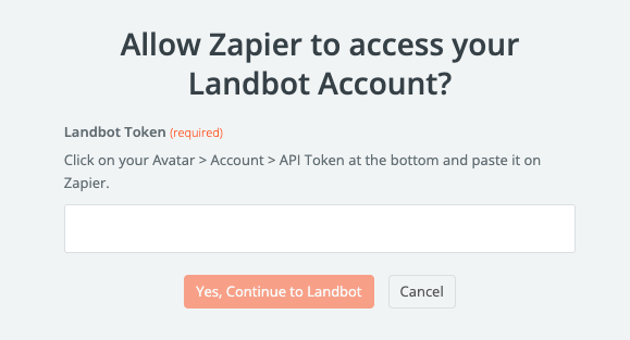 First, connect your Landbot account. You’ll be prompted to add your Landbot API token in a pop-up: