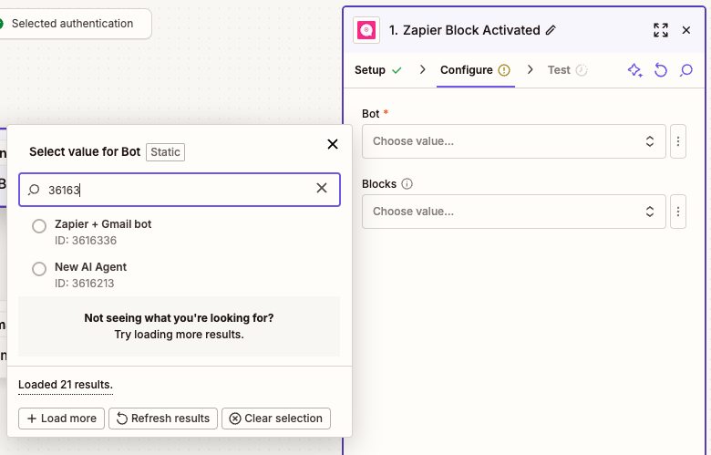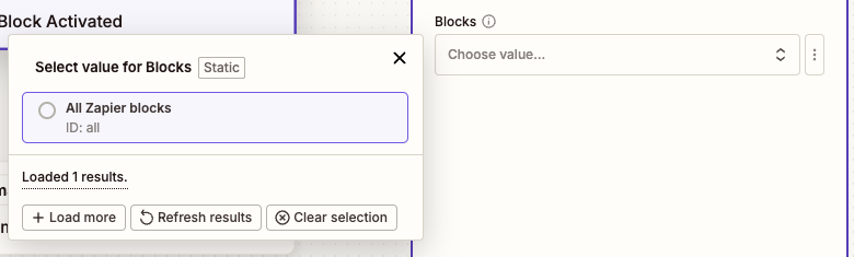 If you have more than one Zapier block in your flow, include the Block ID too. If not, just use the standard selection:
