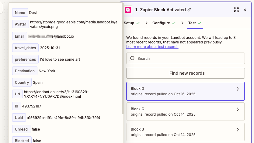 Zapier will pull recent chat records from your Landbot account. Select one record from this specific bot to run the test.