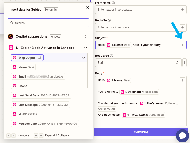 Dynamic fields: Use the + button to insert data from your bot (for example, @{name} in the subject line or email body).