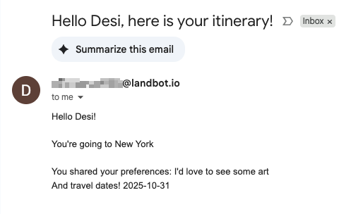 To make sure everything works smoothly, go back to Landbot and test your bot again. Use the Share Link / Test this Bot option, try with different inputs and browsers, and confirm that the emails are sent every time.