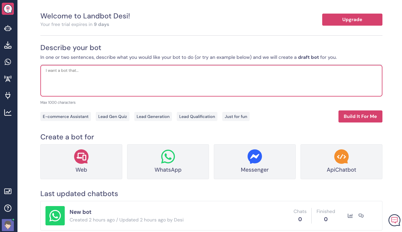 Welcome to Landbot! 🥳 Once you log in, you’ll enter a clean, intuitive workspace designed to help you create, manage, and optimize chatbots effortlessly.