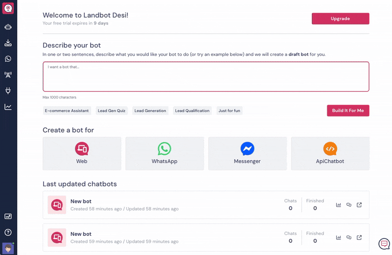 1️⃣ 🔧 Build it for me: At the top of the Home screen, you'll find our Build it for Me option, in which you describe what you'd like your bot to do and we create a draft bot for you. You can also select one of the templates options right below it, to see how it works!