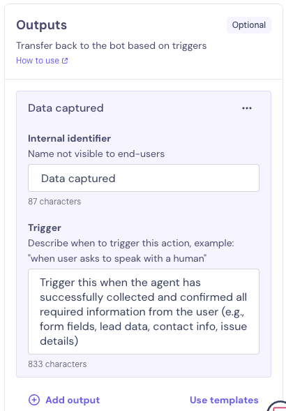 Give each Output a meaningful name (e.g., โUnqualified Lead,โ โNeeds Human Talk,โ โFinish FAQโ) so you can easily tell them apart โน๏ธ - Reinforce the Output in the Instructions