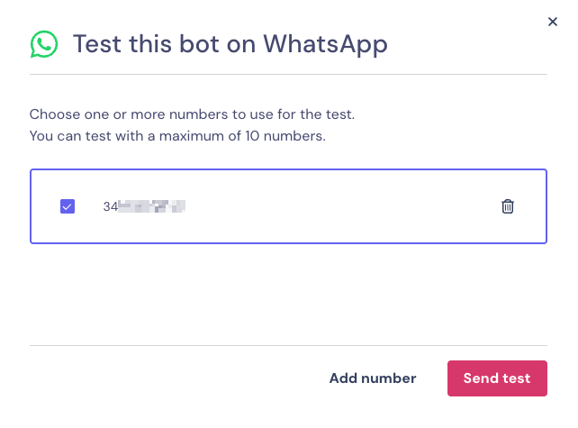 You can use the Test this bot feature directly from the builder. How it works depends on your setup: if you don’t have a number integrated, you can test right away, and if you do, you’ll be able to run tests with your own number.