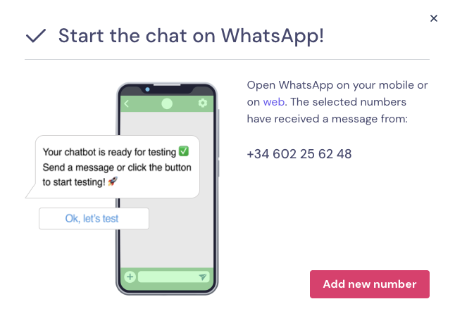 To test a different bot, go to the builder of the new bot you want to try and follow the steps described above. You’ll receive a WhatsApp message on your phone to start testing the new bot.