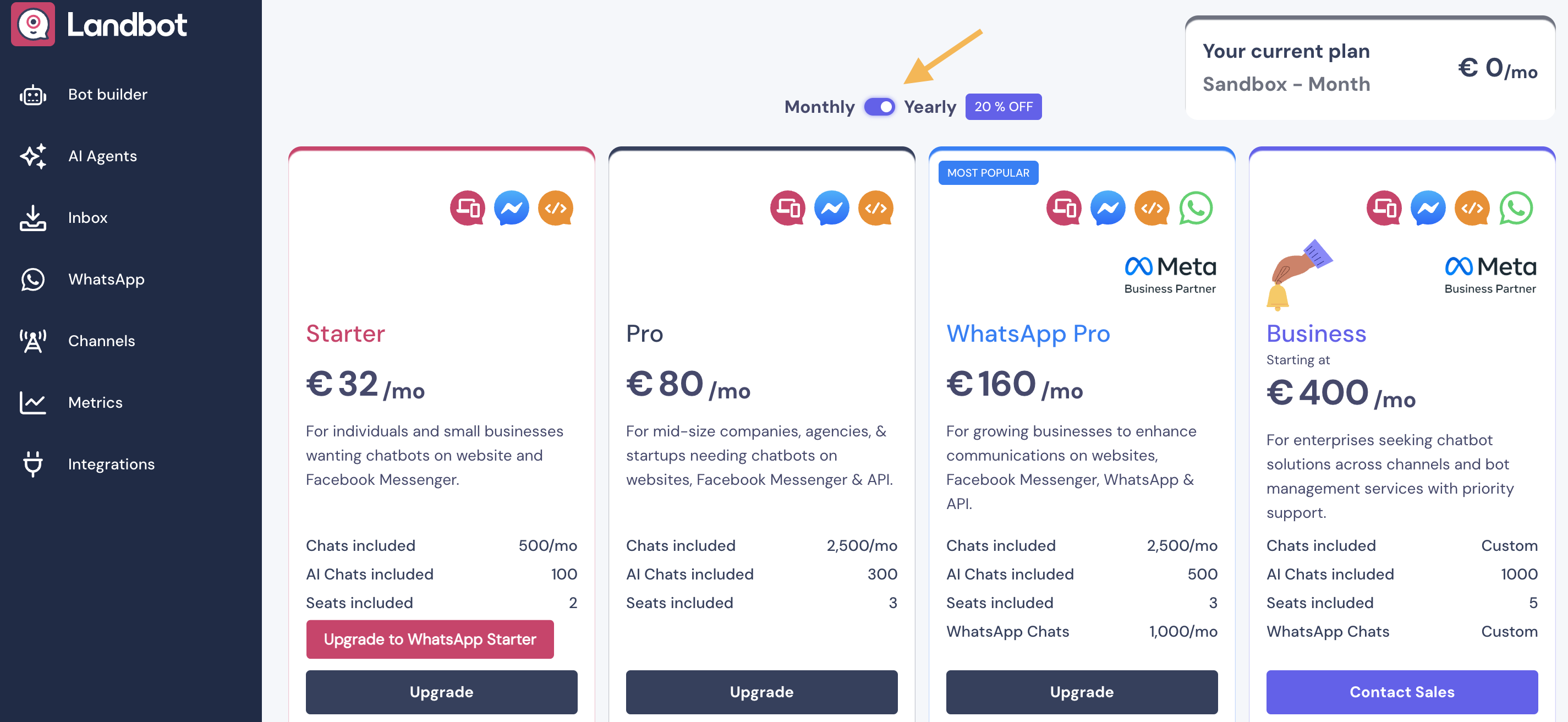On the Plans & Pricing page, you're going to find the Plans comparison. You can select between plans for Web and plans for WhatsApp: