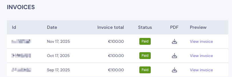 After every payment, an invoice will be generated in your Invoices section. It is possible to download the invoices as a PDF by clicking on the icon below PDF.