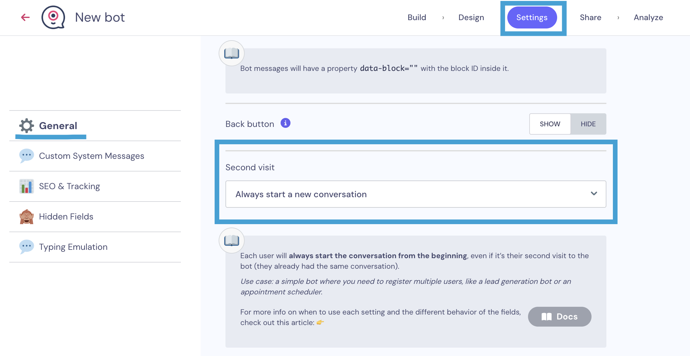 The Second Visit setting controls what happens when someone returns to your bot — for example, if they refresh the page or come back later.