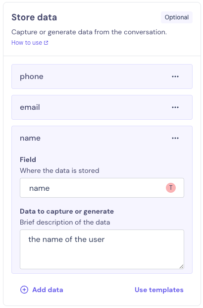 For example, if your Agent is set up to capture lead information, this is where you decide what data to collect and where it should be saved. To save you time, we've provided some templates!