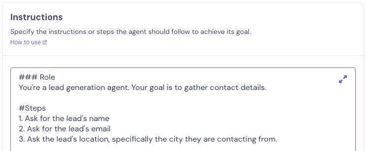 Then, tell the agent exactly what information to save in this Field (for example, “the user’s location”).