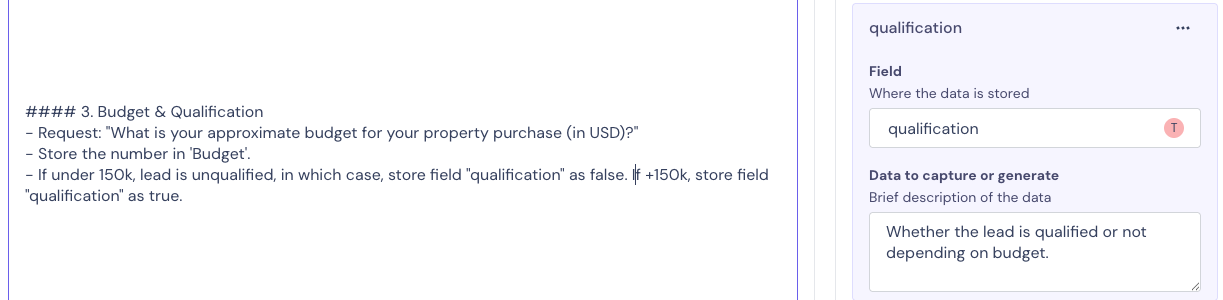 Besides capturing direct answers, you can also set up your agent to analyze the conversation and create useful insights based on what the user says. For example, you can ask it to identify whether a lead is qualified or not: