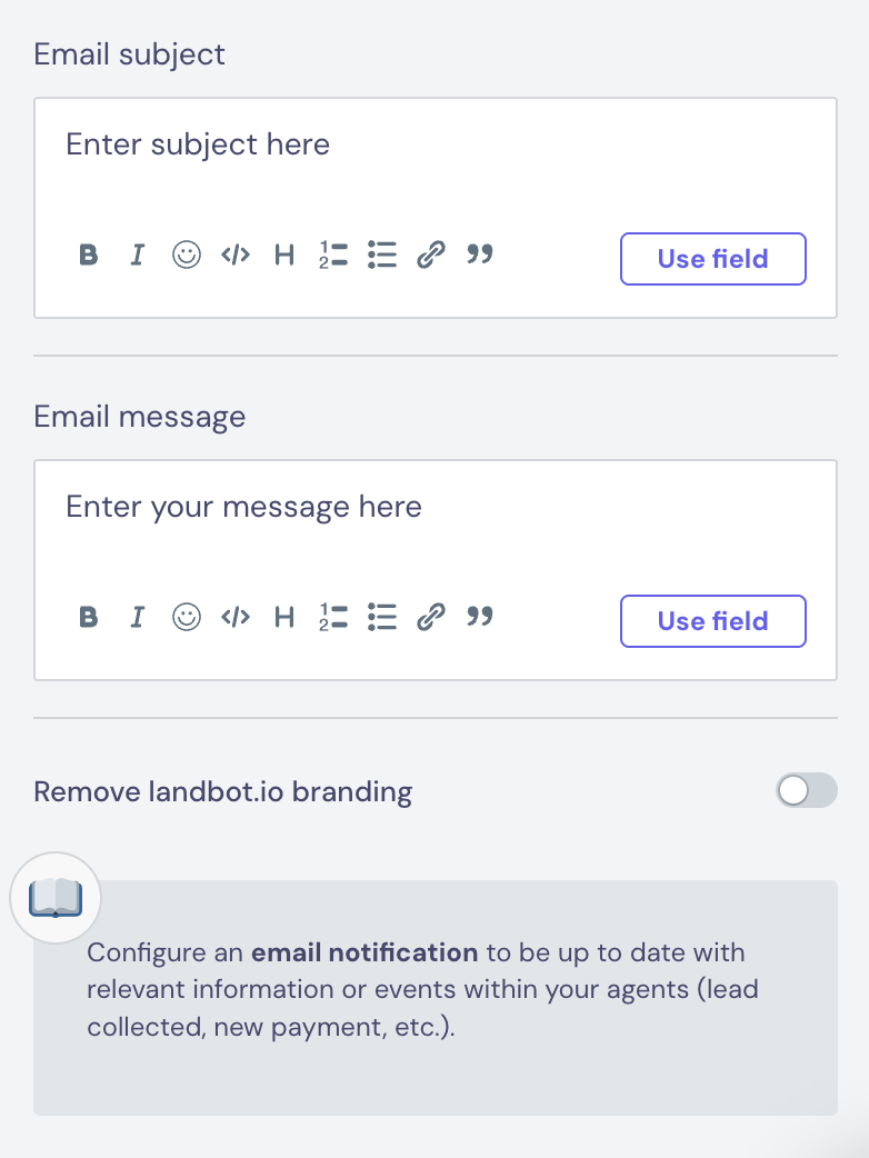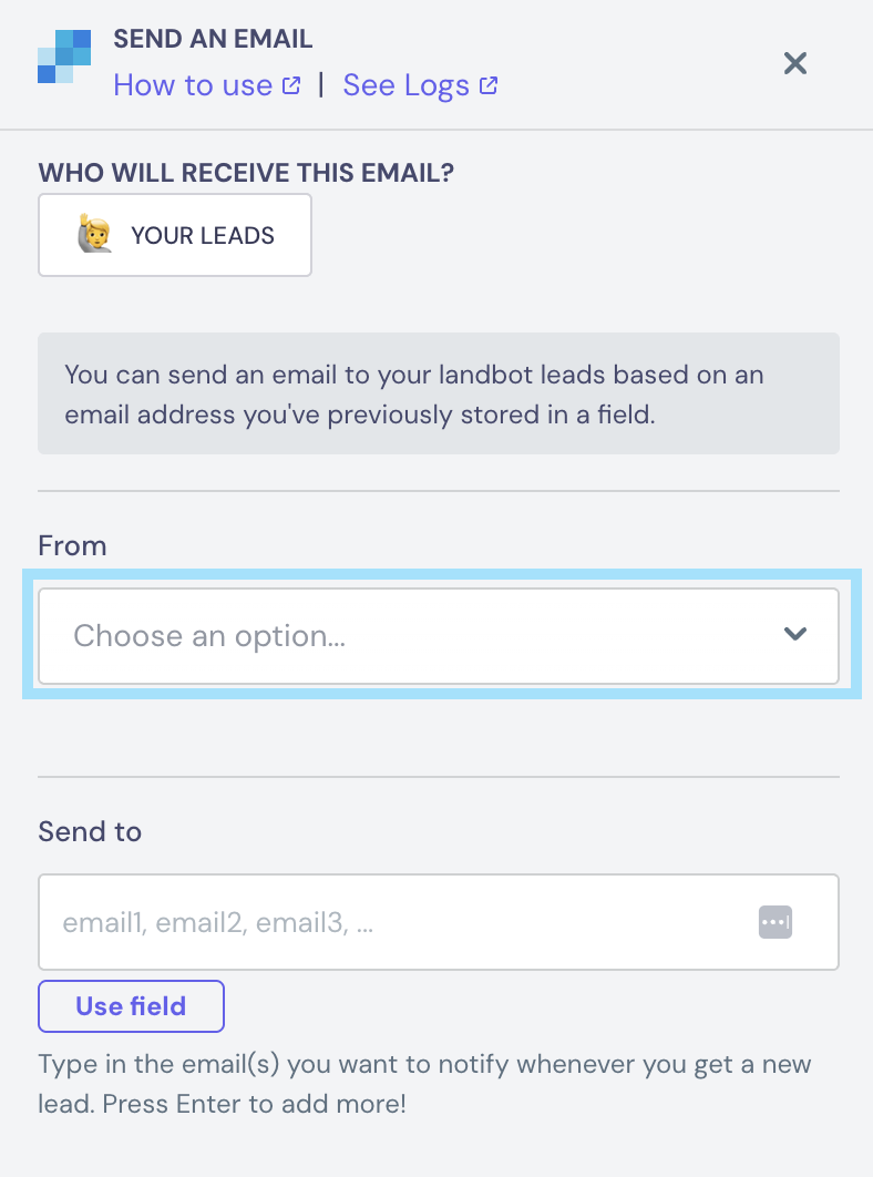 When you are using the Send Email block, there are two options to choose the email address you can use to send emails: Landbot email server and a Custom email.