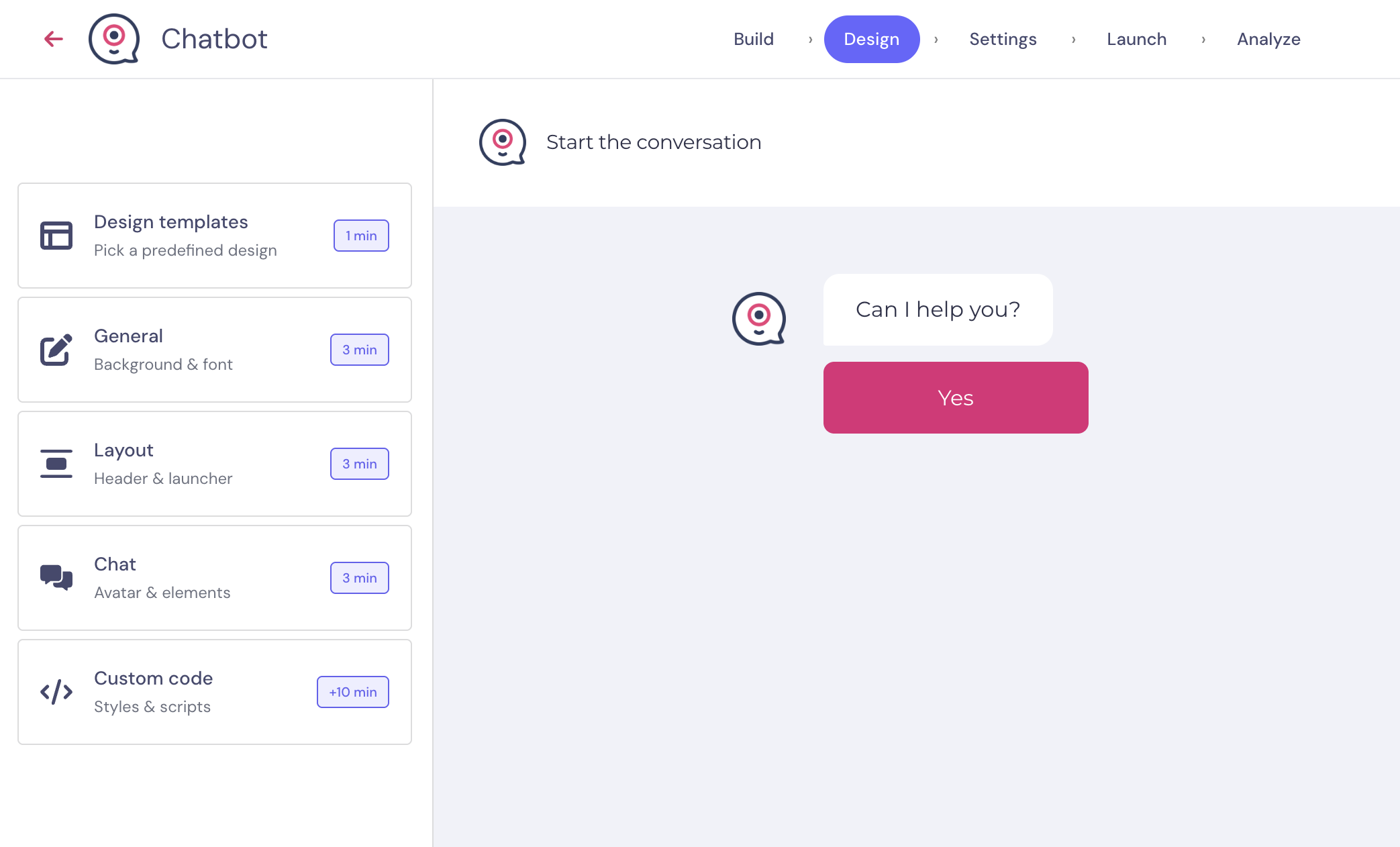 The bubble launcher is the way the bot will look on your page before you open it. This will be only applicable when the bot is in live chat or pop-up mode.
