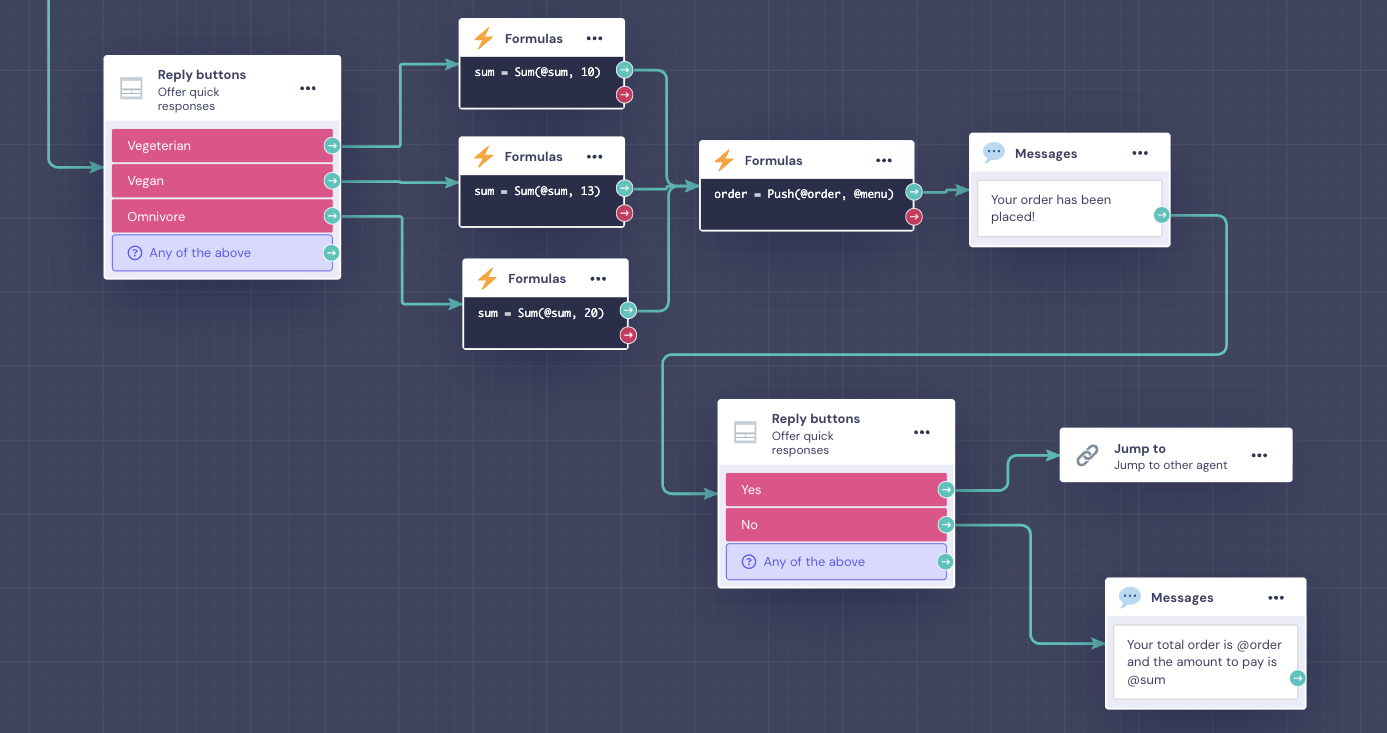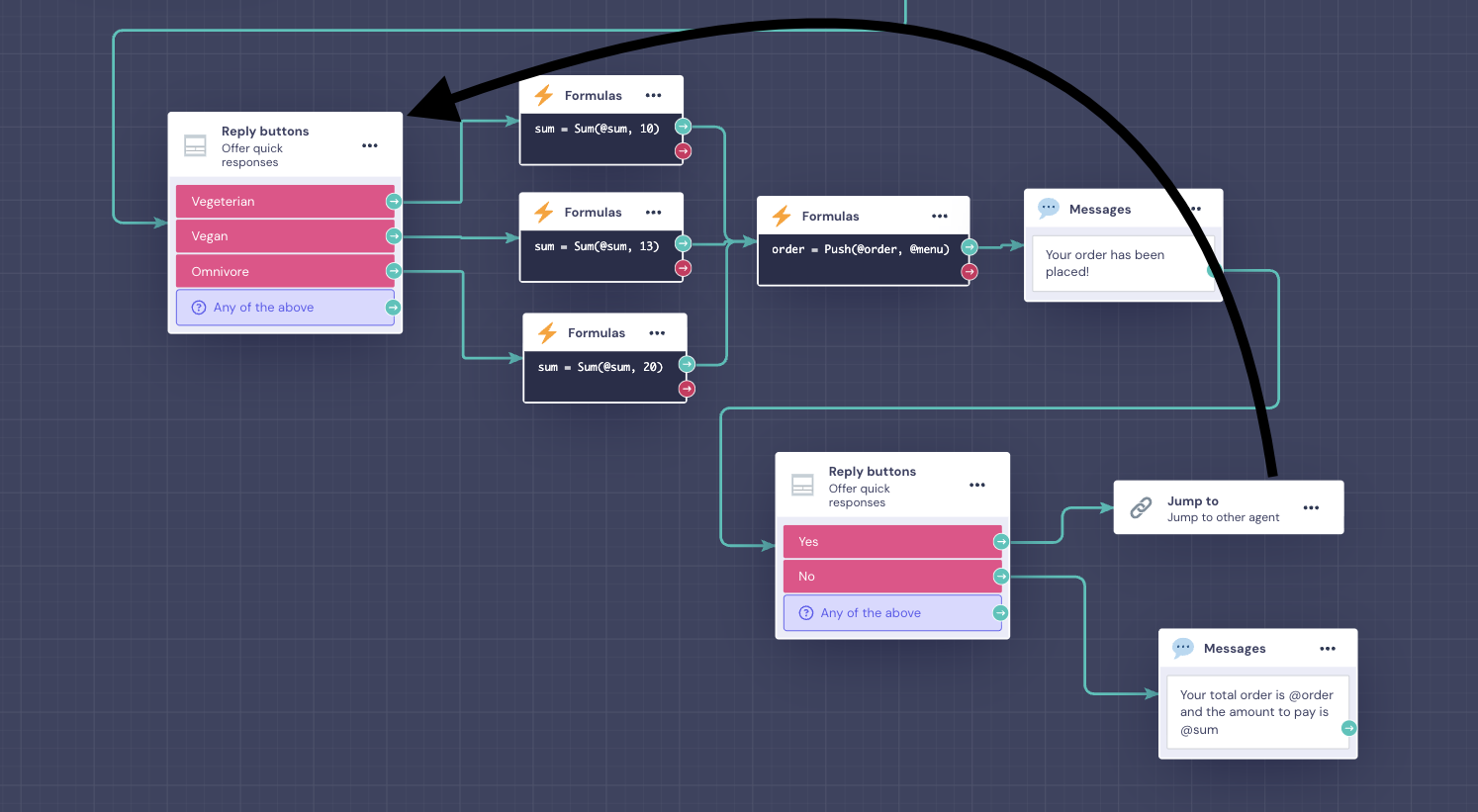 At the end of the flow, we ask the user if they want to keep ordering, if so, we use a jump to block to jump the user to the Reply Button block that has the options.