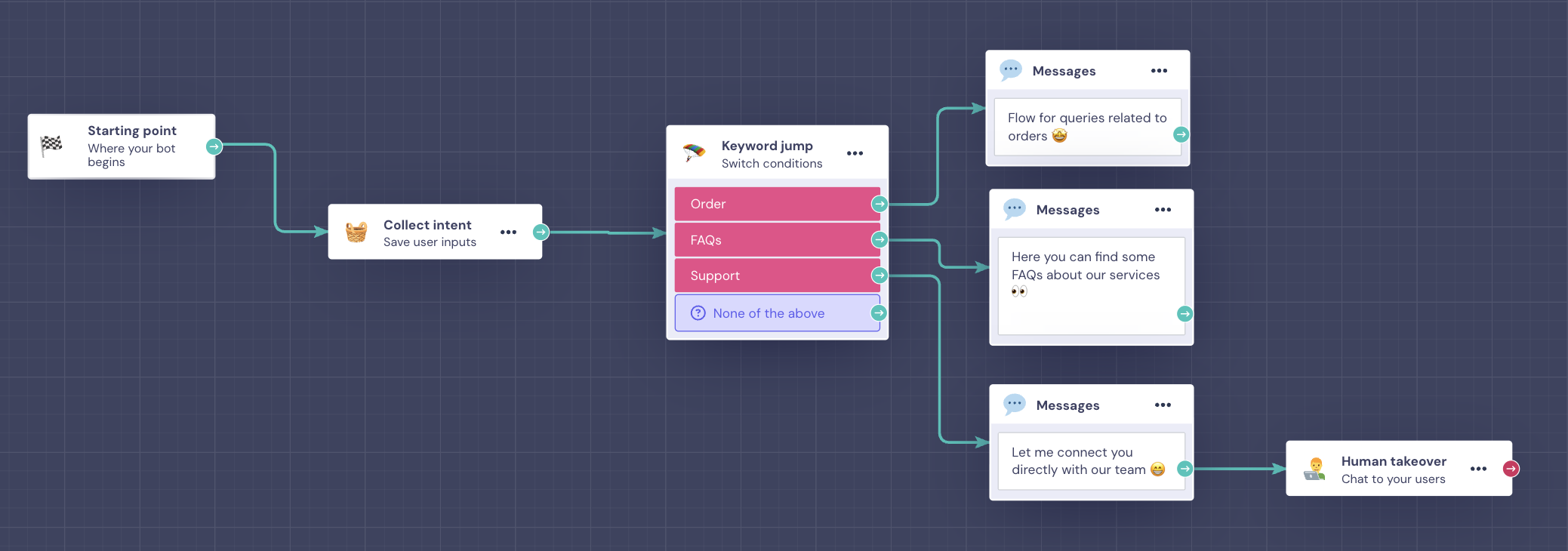 You can also use theΒ Keyword JumpΒ block to point to several different paths of the bot if the field contains one of the keywords provided. π―