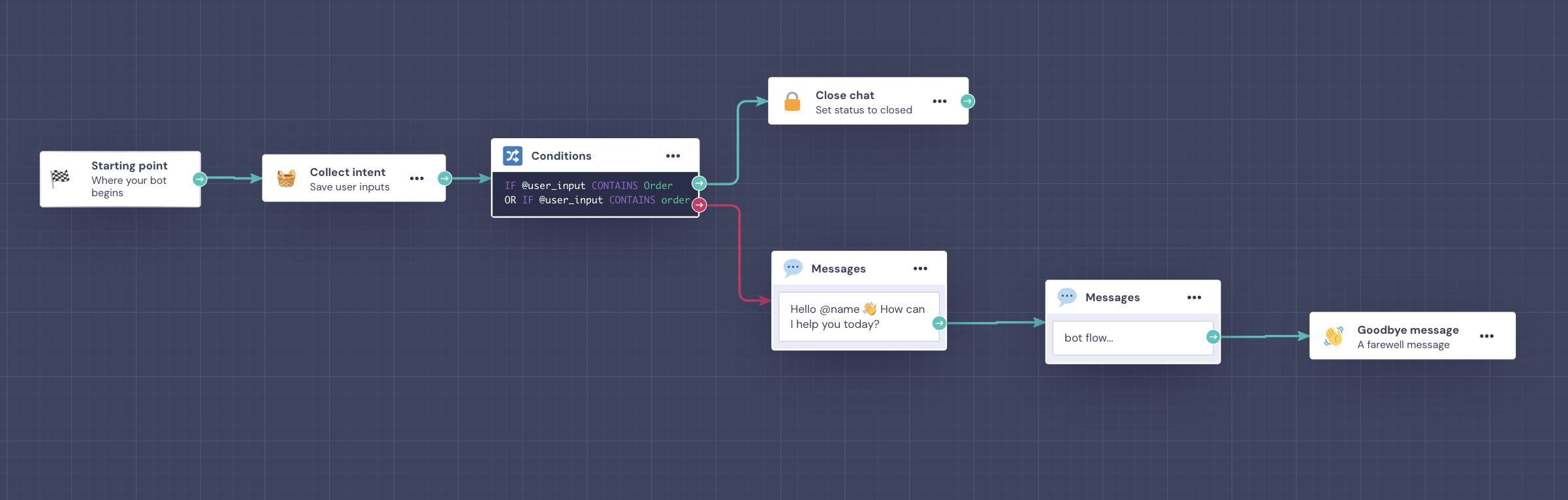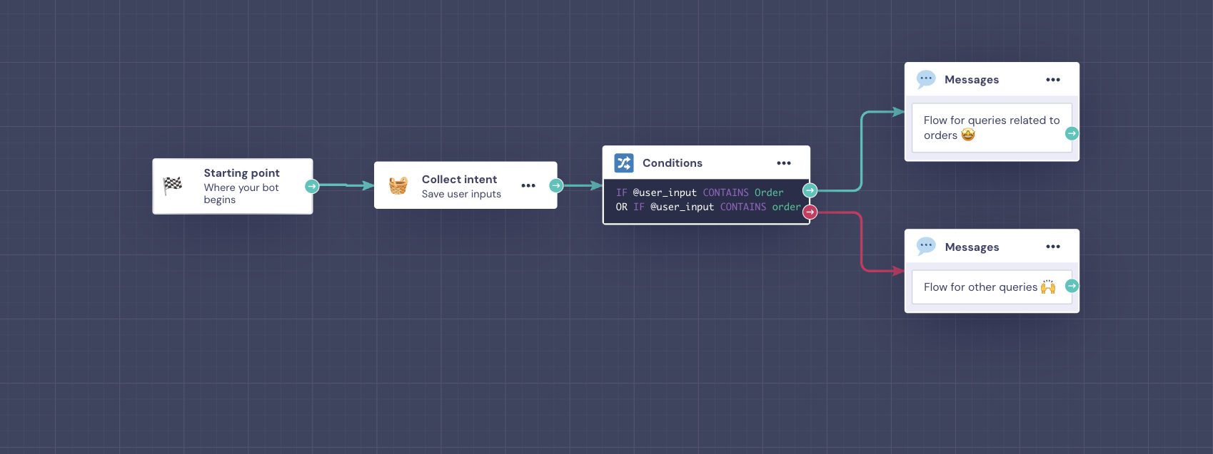 IF @user_input CONTAINS βorderβ, you can point to a specific path in the bot. β‘οΈ